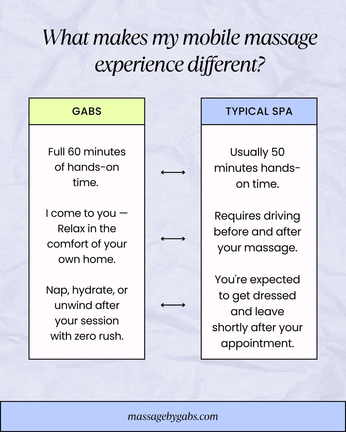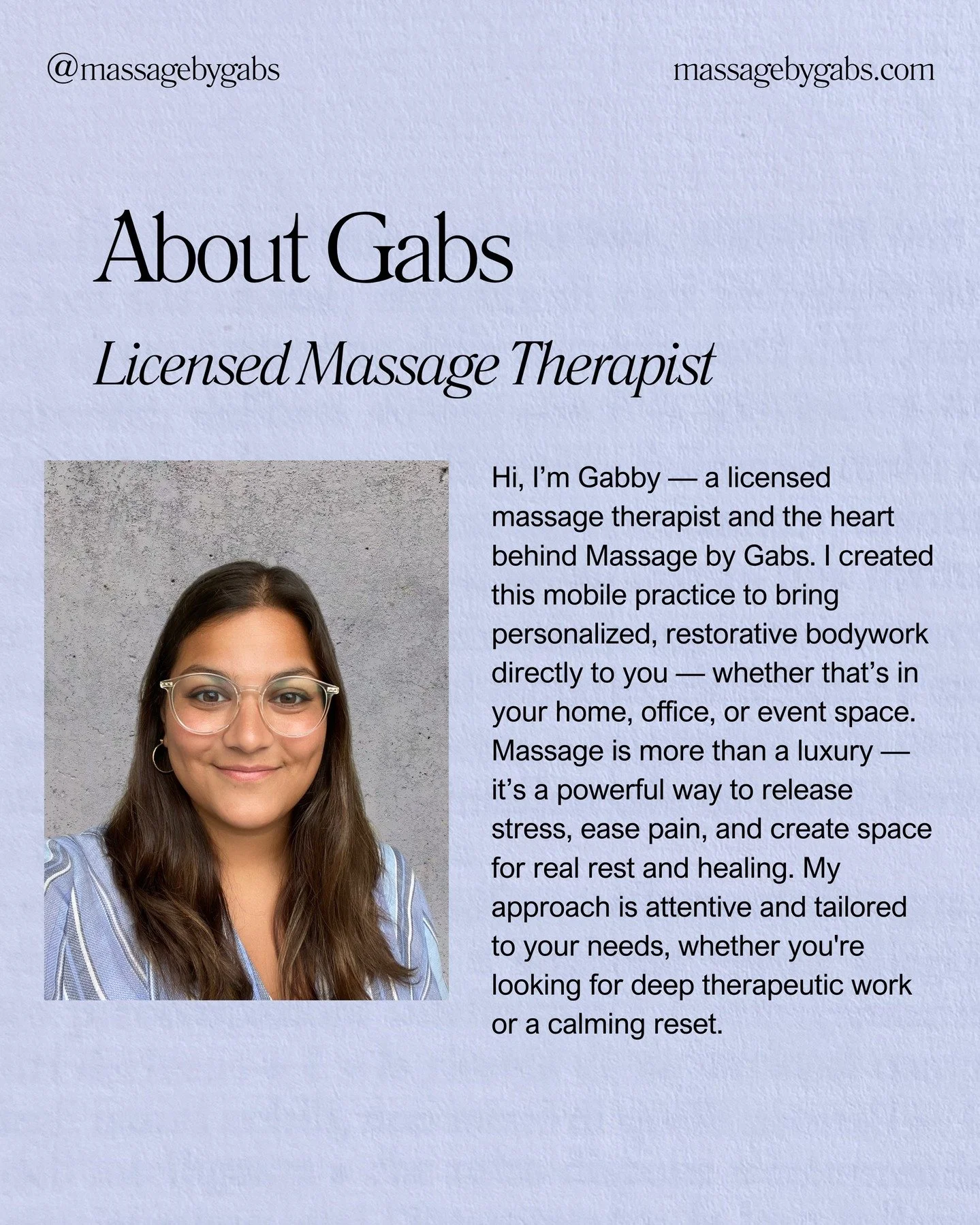 You can reach me at gabs@massagebygabs.com or via phone at (630) 534-2437.